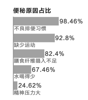 浙江大学医学院附属邵逸夫医院消化内科医师、便秘联合门诊负责人赵岚说,临床上将超过3天或更长时间排一次便定义为便秘。饮食精细化,工作生活压力增大,现代人要想每天保持大便通畅,似乎越来越困难了。据统计,我国每5人中就有1人便秘,便秘影响着各年龄段的人。前不久,她对门诊中的130位患者进行了追踪调查,发现诱发便秘的常见原因有五大类,以出现概率排名依次为:不良排便习惯、缺乏运动、膳食纤维摄入不足、水喝得少、精神压力大。