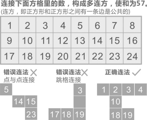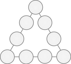 在下图的圆圈内填入1-9,使每条边上四个数的和相等。尝试多种填法。