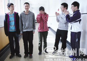 杭二中五位夺得金牌的学生接受采访,男生“膜拜”第一名得主林心悦。 记者 许康平 摄