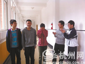 四位男生表示很佩服林心悦,林心悦不好意思地捂脸了(杭二中五位金牌得主左起:顾羽中、方辰左、林心悦、王宇晗、蔡进逸)