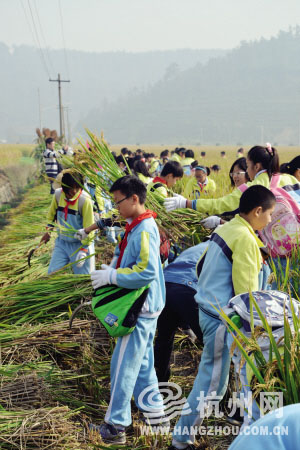 弓着腰、弯着背,左手抓稻秆、右手握镰刀,这样的割稻体验,对现在太多孩子来说,是完全陌生的。上周,崇文实验学校就让六年级的孩子来了一次真正的田间之旅——下田割稻。