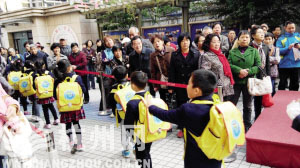 上周五下午2:40,采荷二小门口,校门大开,家长们规矩地站在门外,翘首等待自己的孩子。队伍中,老年人占了大多数。一个扎马尾的年轻女孩特别引人注目,她也是来接孩子放学的,不过是培训机构的老师。