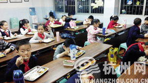 长江实验小学特困班学生在学校里吃晚饭。