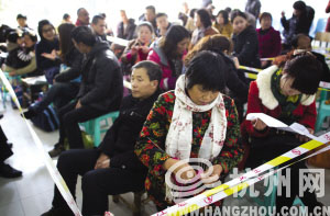 拱墅区青少年宫,一名排队拿报名号子的家长在打毛线。记者 朱丹阳 摄
