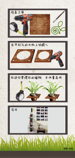 最令“布记”自豪的花架是两款悬挂式的作品,利用家中的废弃物品稍加处理后,居然成为了一道亮丽的风景线,不仅不会显得杂乱而且别有趣味。一款皮带花架,用上两根废皮带,两款木板和几枚钉子,做成一个两层的“秋千”,再将植物放上,整齐排列。另一款分层悬吊式花架,工程量要大些,用上木料、绳子等,不过也十分美观。