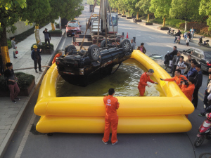 水流同时从汽车前挡和驾驶座车窗涌入车内,速度很快,车子迅速下沉。尽管有充分准备,当水涌进来时,车里的两位实验员还是一片混乱。“如果人是头朝下倒着入水的话,水马上就把头部淹了,再加上翻车是突然发生的,不可能有准备,肯定被颠得七荤八素,这种情况下,能立马缓过神开始自救的,基本属于超人了。”实验员大史说。