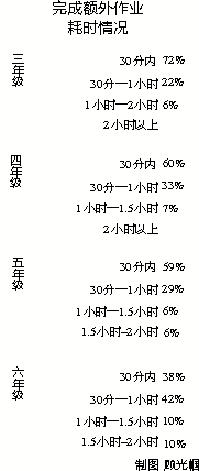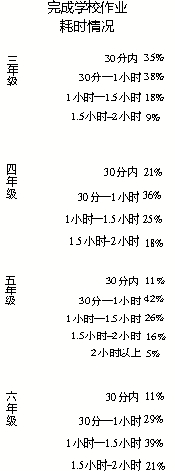 每天完成学校布置的作业所需要的时间,中段在1小时内占大多数,比如三年级,在30分钟以内的占35%,30分钟到1小时的占38%。而年级越高,所花时间就越多,到五年级,超过1小时占47%,其中用时1小时至1.5小时的占26%,用时1.5小时至2小时的占16%,有5%的学生用时超过2小时。到六年级,超过1小时的作业时间更普遍,占60%,其中用时1小时至1.5小时的占39%,用时1.5小时至2小时的占21%。