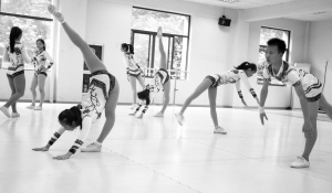 音乐响起,同学们先表演了一段健美操:整齐划一的动作,中间穿插着各种动作幅度很大的托马斯全旋、单手轻松撑起整个身体,凌空跃起等动作。有时候,男队员还要把女队员举起来,这跟传统的健美操很不一样。