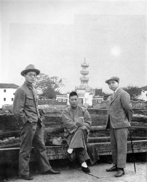 1928年春,杨虎城(中)和妻子谢葆真(右)、机要秘书米暂沉(左)游历杭州时留影。