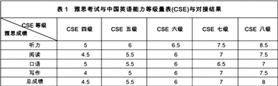中国教育部考试中心与英国文化教育协会1月15日联合举办发布会,共同发布了雅思、普思考试与中国英语能力等级(CSE)量表的对接研究结果。对接结果表如下:CSE四级对应雅思听力5分、阅读4.5分、口语5分、写作4分,总分4.5分。而雅思总分6分,对应CSE六级水平;雅思总分8分,对应CSE八级水平。