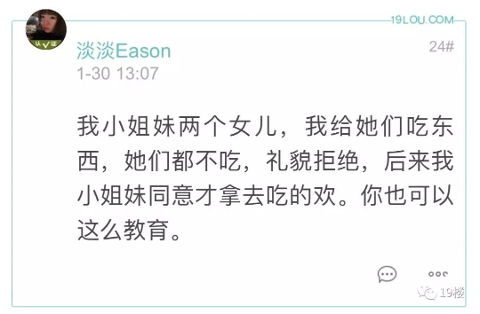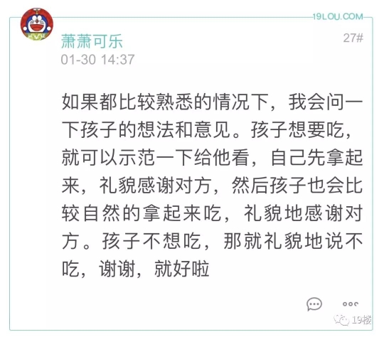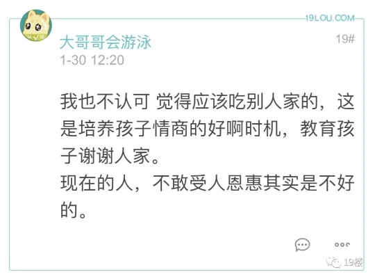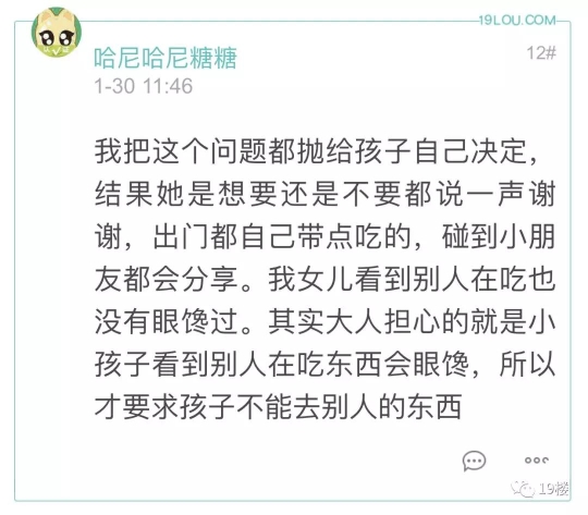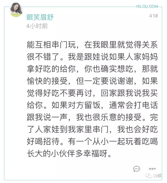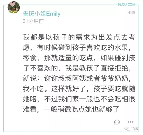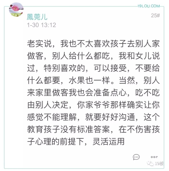19楼 出带小孩去邻居家串门,邻居给的水果该不该吃?有网友因为这个问题和老一辈产生了冲突…… 19楼网友@飘李 爆料: 娃6岁,幼儿园大班。放寒假了白天在家,家里老人就带去串门了,小区里有一个玩的比较好的小朋友,叫a吧。昨天老人回来说,娃在人家家里吃水果一点都不拘束,觉得这样没家教。很生气,说以后不能吃别人家东西。以后也不让我带他在别人家吃饭。 于是晚上邻居a的爷爷带他家二娃娃来我们家玩,爷爷肯定想着要还点回去了,准备水果,就招呼人家孩子吃,但是人家孩子爷爷不发话,孩子就不吃,把我家爷爷给羡慕坏了,单独跟我说人家妈妈教的好。人家妈妈就不让孩子在外面吃东西。 我没反驳,但是我是心里是不认可他的想法的。 平日周末我带去这个邻居a家玩比较多,邻居妈妈也都熟,有时候邻居妈妈会拿水果,地瓜干,榛子啥的出来吃,我也没有扭捏,很放松很自然都会吃,娃吃我也没不让,我觉得只要卫生习惯好,给了就吃了,娃受我影响。 老人说的不让在别人家吃饭,是另外一个邻居b,我的老乡。小孩子差不多大,也是发小。常去串门,有时候娃玩的不肯回来,邻居奶奶会留他吃饭,我也没拒绝。娃在邻居家吃,我回家吃。也邀请小朋友来我家吃饭。平时这个邻居家很忙,因为有个更小的二娃,我也会带2娃一起外出玩。 相对来说,我和娃就这2个邻居走动比较多的。家里老人走动多的是第一个。爷爷老家一个地方的。 我小时候的教育也是,不能吃别人家东西,人家吃饭的时候不能在人家家里玩。现在社会生活水平好了,反而是娃与周围小朋友的的交流与互动需要保护,我不想强加我们这代人的习惯给娃。 困惑,怎么才是对的?大概情况这样,也听听大家或专家的意见。小孩子去邻居家到底能不能吃给的东西 怎么吃才能把握好尺度?评论里各位家长都发表了自己的意见 大部分认为如果孩子想吃 可以适当吃点没关系