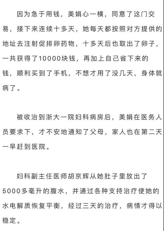 “你在做试管婴儿吗?”医生一脸疑惑。 “没有没有,我连男朋友都没有”,美娟连连否认。 很明显,一定有其他原因让美娟在近期注射了促排卵药,不过,究竟是什么原因呢? 真相背后,牵出一起黑市交易 面对医生的问题,美娟开始眼神闪躲,不是三缄其口,就是索性不理会医生,最后还拎着包就打算走。 如此反常的表现更加加重医生的怀疑:她一定没有说实话。 当务之急,是弄清楚她为什么注射促排卵药,见美娟闭口不语,医生只能严肃地跟她说:“你这种情况,随时会死的!”这句略带“威胁”的话瞬间击溃了她的心理防线,将事实全部告诉了医生。 美娟来自浙南一个小镇,家里经济条件还算可以,在亲戚眼中一直都是“乖乖女”。不久前,看着班级里有些同学买了iPhone XS Max,她很是羡慕,却又不好意思开口向家里要钱,强烈的虚荣心让她有点丧失理智了。 她开始寻找各种“快速赚钱”的方法,有一天,在学校公厕的隔板上看到寻找“捐卵子志愿者”的小广告,酬劳还不菲,心动的她试着添加了QQ号,对方告诉她:卖卵子对身体没有伤害,只需要每天打打针,半个月后取出卵子,就可以赚1、2万。