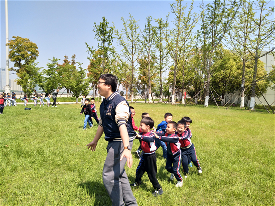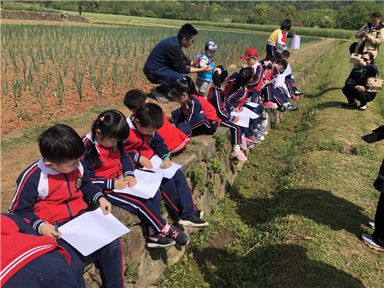 欢笑打闹之余,公园里盛开的各种品种的花,也为孩子带来了乐趣,他们闻着花香、在树下捡着花瓣,观察着树下的小虫子、欣赏着刚长出嫩芽的小草……真是乐不思蜀了。 中班的孩子还在爸爸们和老师们的带领和讲解下对钱塘江边杭城的历史变迁和变化有了更深刻的印象,让孩子们为生活在杭州而感到无比的幸福和自豪! 大班孩子们来到了八卦田寻找春天。虽然路途遥远,但当孩子们闻到大山里的味道,脚步踏在田间小路,叽叽喳喳地认着春天的蔬菜瓜果时,路途的辛苦一扫而空。走田埂、喂小鱼、找河蚌、写生、玩游戏……在美丽的八卦田欣赏风景,感受蓝天白云,感受属于自己的精彩童年,留下值得回忆的美好瞬间。