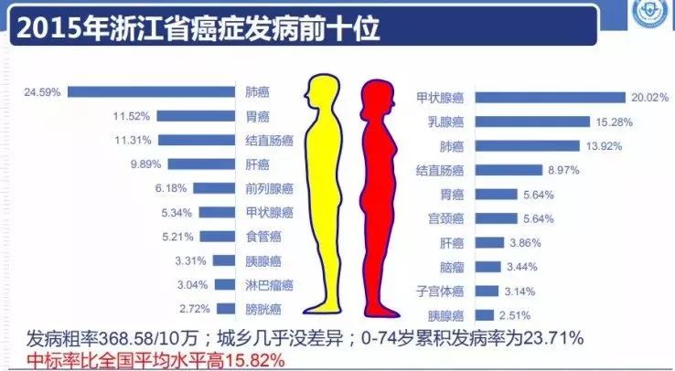 从图表上可以看出,2015年浙江省癌症发病统计中,男性肺癌、胃癌、结直肠癌排在前三;女性甲状腺癌、乳腺癌、肺癌排在前三。