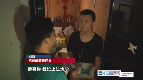 杭州邮政投递员 刘凯 恭喜你,我没上过大学,祝你读大学时多努力学习。 第二封录取通知书要送到江城路童霖杰家里,由于儿子并不在家,童霖杰的妈妈吴女士代为签收。打开这份录取通知书,吴女士兴奋地说,儿子和老公终于做成校友了。