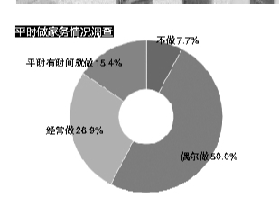 问卷调查显示,50%的孩子会偶尔做家务,7.69%的孩子从不做家务。面对孩子的主动做家务的要求,95.83%的家长选择表示愿意鼓励孩子,但真正付诸实施还是为数不多。