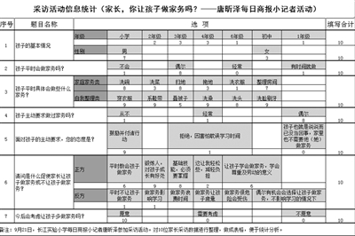唐昕泽小记者则在调查结束后整理归纳,发来了自己整理后的表格。唐爸爸表示,这是孩子第一次接触问卷调查。唐爸爸说,孩子在完成采访后,就自己开始一张张地看问卷,他自己看着看着就发现:“哎,这里有个人选的就是不会做家务。”唐爸爸告诉记者,“(周末)晚上很晚了,(孩子)还在统计。(孩子)不知道什么是统计,(我)就让他把10张表格的数据凑在一起,一个一个记到纸上,画正。”最终唐昕泽整理出了一份自己的总结表格,也在投稿上表明:“以后我要更加多多做家务,做个爱劳动的少年。”