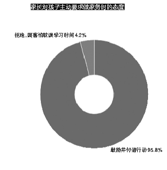 调查问卷显示,95.83%的家长在面对孩子主动要求做家务时会鼓励孩子,有84.62%的家长愿意今后让孩子多做家务。12.28%的家长表示平时会教孩子做家务,19.2%的家长表示做家务是必须要掌握的基础技能,19.3%的家长表示有意让孩子学会做家务,21.1%的家长表示觉得做家务对孩子成长有帮助,4.7%的家长表示让孩子做家务会减轻家长家务负担,4.7%的家长表示在不影响学习的情况下,偶尔会让孩子做家务。