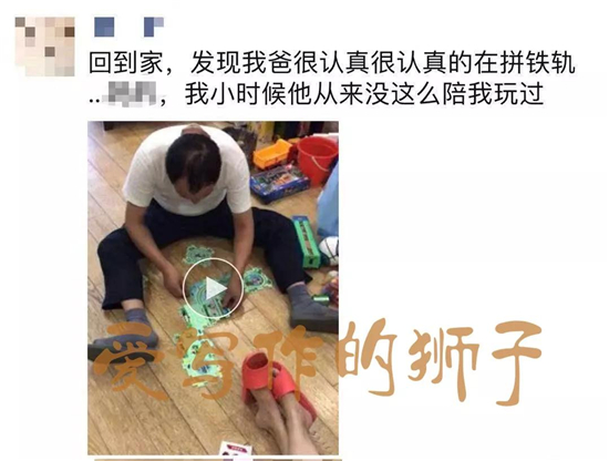 视频里,爷爷坐在地上,埋头拿过一块轨道拼好。动作不快,看得出来,非常认真。 羽毛爸爸说:“我小时候,放暑假是被一个人锁在家里的。家里一共俩房间,一个有电视机,为了防止我看电视不做作业,那个房间也锁了。我能玩的区域就只有在客厅和小房间,然后趴在窗台上看楼下的小朋友玩。”小时候爸妈都上班,没时间管没时间陪,现在对孙辈就是报复性的对他好。 “我小时候,我爸从来没给我讲过故事。现在,我儿子听故事,都可以提要求,让他现编。前两天,我儿子说‘爷爷,给我讲个小猴子不爱刷牙的故事吧’。爷爷说了一声好,就开始编了。我也是很佩服啊!” |