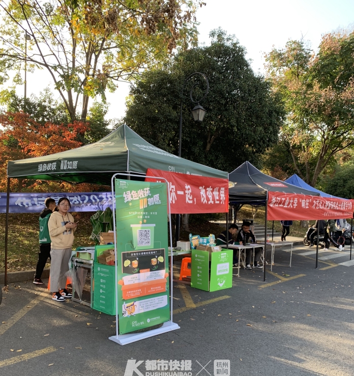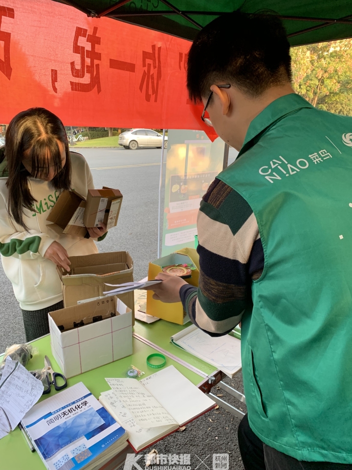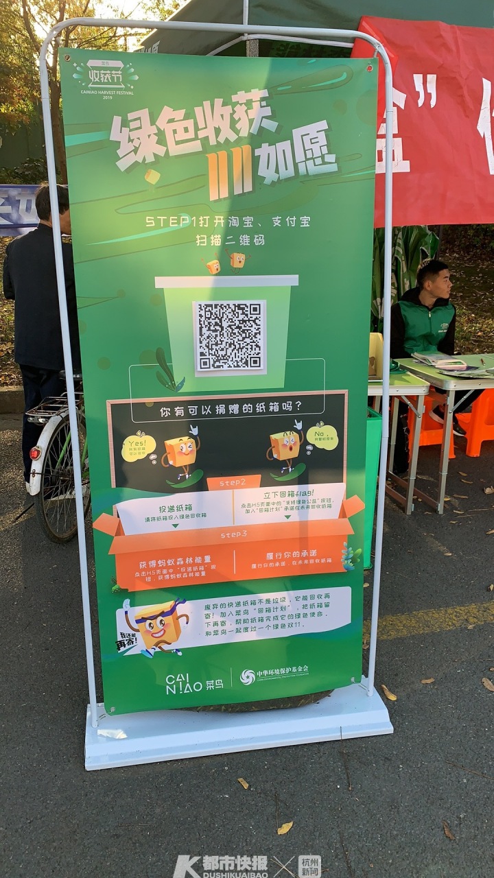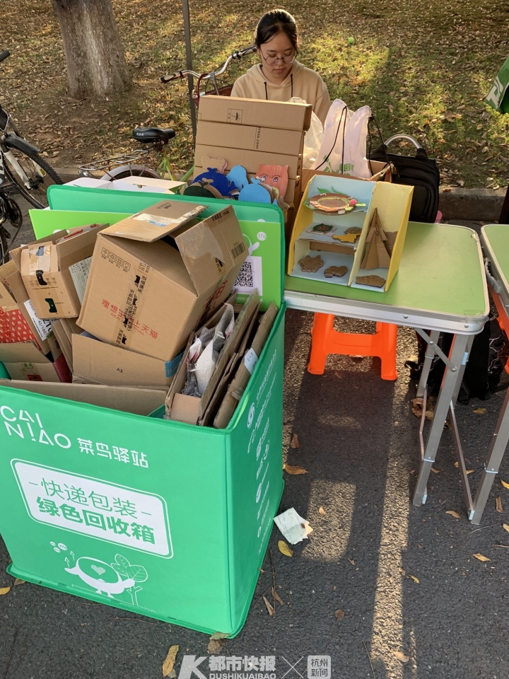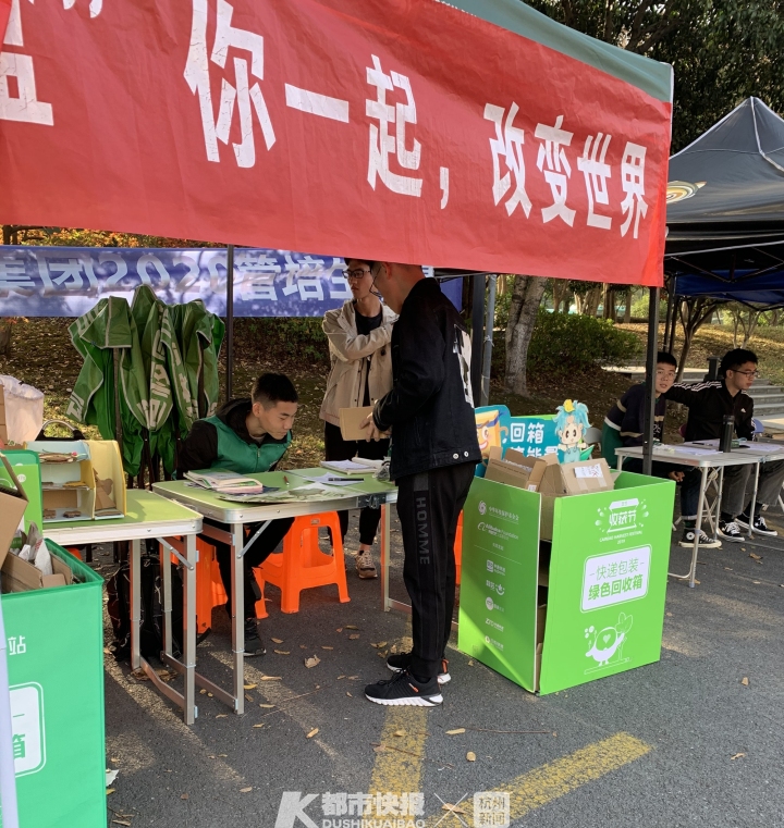 摄影 | 万禺 我拿起手机,对着易拉宝上的二维码一扫,手机屏幕马上出现了“参与纸箱回收 助力绿色公益”的页面。 点击页面上的投递纸箱按钮,页面跳转出“辛苦了!城市环保大使”的字样。而下方的回收纸箱用途,标注着二次循环使用和回收制成新纸箱两类。 正在摊位上统计快递盒数量的姚同学告诉我,早在上个月的20日,他所在的浙江工业大学绿色环保协会,就报名参与了由菜鸟发起的校园“纸箱回收”挑战赛。 “听我们协会的负责人说,这个活动吸引了全国60多所高校加入。”姚同学是浙江工业大学建筑工程学院一名大一新生。爱好环保的他,上大学加入的第一个社团,就是有着20年历史、多次荣获浙江工业大学十佳社团称号的绿色环保协会。 坐在姚同学旁边的女社员卢同学,是环境学院的大一新生。她对我说,绿色环保协会是一个大社团,6个部门的干事和会员加起来,有100多号人。“负责人和社团同学说了‘纸箱回收’这个活动后,协会里的同学都报名参加了。” 11月11日-14日,每天从早上7点半开始出摊,一直到下午5点结束,全天一共5个时间段。协会成员分工明确——有发宣传单的,有记录回收的纸箱数量的,还有机动人员,每个时间段各来6人。4天下来,社团100多号人全部参与了这次“纸箱回收”挑战赛。