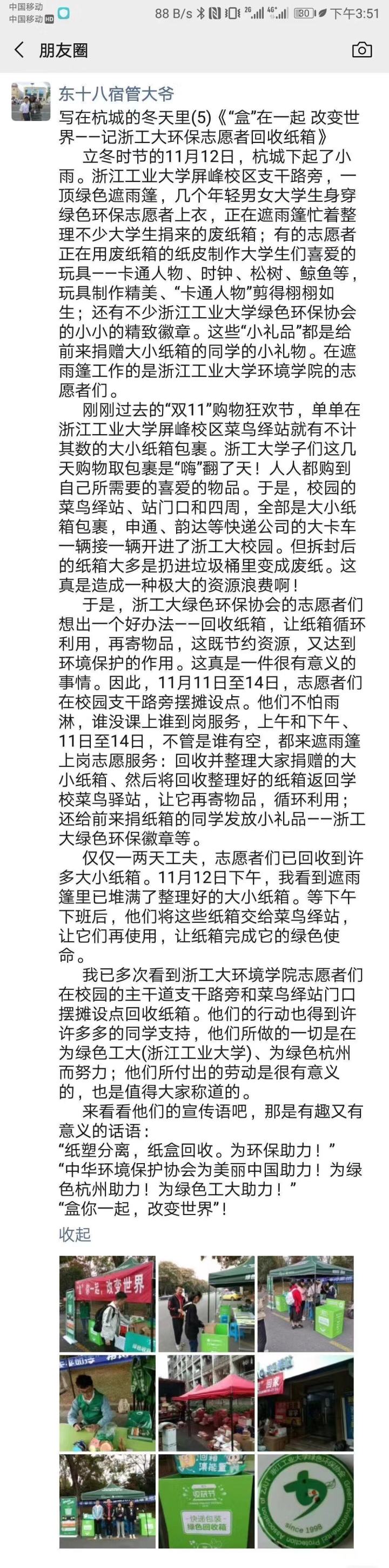 宿管大爷发在朋友圈的“小作文” 事实上,不仅是浙工大的这帮学生在行动,社会上,越来越多的杭州人也开始有了快递盒回收的意识。 百多名社团成员全体出动 参与“纸箱回收”高校挑战赛 昨天下午,我来到浙江工业大学屏峰校区。顺着校门口的支干路一直往里走,步行大概3分钟后,沿路靠左的一个小摊上方,“‘盒’你一起,改变世界”的红底白字横幅跃入眼帘。