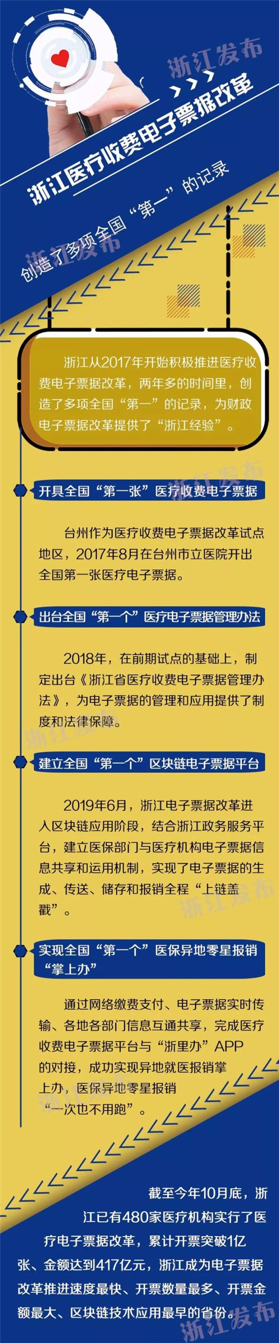 浙江发布讯 截至2019年10月底,浙江已有480家医疗机构实行医疗电子票据改革,以后不用担心报销时找不到发票啦。 18日上午,省政府新闻办举行浙江省借力区块链技术推进医疗电子票据改革成效新闻发布会。 医疗收费票据 指财政票据在医疗收费领域的票据,即城乡居民在就医过程中取得的“发票”。浙江每年的财政票据开具量达到8亿张,其中医疗票据占比超过75%。 省财政厅联合省卫生健康委、省医保局、省大数据局共同推进医疗收费电子票据改革,借助区块链、云计算、大数据等先进技术,聚焦老百姓看病报销“一件事”,在破解“看病烦、报销慢、监管难、成本高”等方面取得实质性突破。