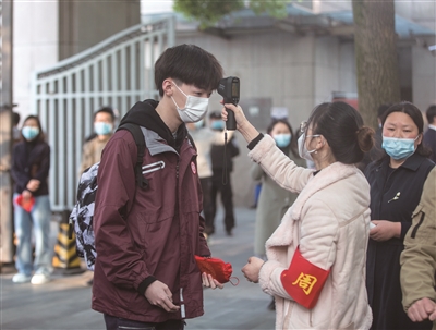 杭州市十三中教育集团 昨天早上七点半,杭十三中近600位初三学生身穿校服,在家长的陪伴下陆续进校。校门口两米之外沿着马路粘贴了一条黄色提示贴,一位女生拎着文件袋从家长的电动车上下来后,家长即刻转身离开。 入校的学生依次刷市民卡,沿着一米线指示进入教学楼。进入教学楼后,学生途经体温检测点,自动扫描接受检测。体温正常者可进入教室,异常者跟着指引走向另一个方向的隔离室。学校教学楼内,随处可见一米贴指引。 每到一处楼梯口,都有“请保持一米距离,上下楼靠右行”的提示。教室门口的走廊上,贴有“间距1米,有序排队,保持安静”,每个教室门口贴有“勤通风,控距离,请保持1米距离”的提醒。 十三中食堂位于地下一楼,食堂门口安装了免洗洗手液消毒液,餐桌按照单人单桌设置,初三学生近600名学生分班在固定位置就餐。 在教学楼二楼教师办公室门口,各位班主任手写温馨寄语送给前来的各位初三学生:“困难是一时的”“爱是永恒的”“欢迎同学老师返校”“见面、微笑、正好”…… 初三(16)班44名学生,进入教室后正在进行早间自习。每个学生单人单桌,保持一定距离。八点十五分,教室内广播响起,所有学生在教室内参加开学典礼,学校副校长杨鑫栋在广播中为学生们加油打气,校医胡芳芳为学生讲解在校防疫知识。 学校校长屈强说,开学第一天帮助学生做好开学准备,了解学校的新秩序,养成好习惯,把这些内容作为开学第一课。 八点五十分,下课铃声响起,学生们走出教室。作为第一次进校的大课间,屈校长说,比一般课间要长,学生们返校后第一次碰面,所以留了较长的时间给他们交流感情。 初三(16)班金悦之说,心情很激动,见到了很久没见的同学们。 初三(14)班王啸天手捧着一叠上学期的奖状,准备发放给班上的同学们。他说,上个学期期末结束来不及领,隔了两个多月,终于拿到了。 育才中学 昨天早上七点开始,杭州育才中学门口,400多名初三同学陆续返校。大家在门口刷卡、测温,有序排队进校。 安吉路实验学校 昨天早上,安吉路实验学校在门口安排了三个智能测温通道。陆续到来的同学,间隔一米排队,学生进校需要刷脸测温,之后刷市民卡,显示绿码之后进入校园。整个过程完成需要三四秒,基本是随到随测随走。 进校园的学生普遍是背着书包再拎一袋学习资料。 从早上的情况看,很多同学迅速适应了状态。901班每个同学桌面上已经摊开了课本或练习本,有的同学忙着在写字学习。黑板上写着“春风吹,战鼓擂”的粉笔字。 好几位同学都跟老师说,这段时间,很期待开学,又可以见到同学和老师了。 安吉路实验学校九年级的同学都带上了一份特别的礼物,精心制作的奖状。复学第一天,同学们要将奖状颁发给心中最想感谢的那个人。 有同学给老师颁发“宇宙第一天团”奖、“金光导师奖”“最具激情奖”“最辛勤教师奖”,感谢老师克服各种困难,坚持线上授课,用妙趣横生的课堂吸引着同学们。 有的同学给爸爸妈妈颁奖,给医护人员、社区工作者、小区志愿者颁奖,感谢他们的最美逆行,让我们岁月静好。 丁兰实验中学 昨天早上,杭州市丁兰实验中学的同学们陆续进入校园,在站岗的老师们引导下,大家保持1米距离,有序排队刷市民卡进校,显示绿码后方可到学校的校训广场进行体温测验。校园内又传来了熟悉的琅琅书声。 杭州市丁兰实验中学书记、副校长吴轶玲在晨会上对同学们说:从未有一次的久别重逢像今天这样充满期待,每一位老师和学生的平安返校让我们倍感欣慰。 |