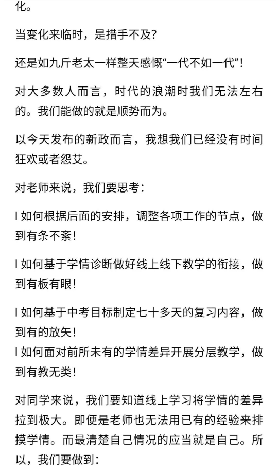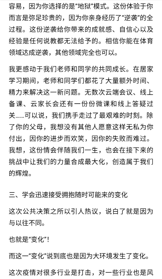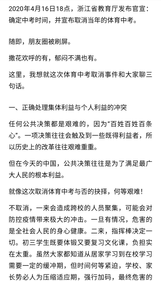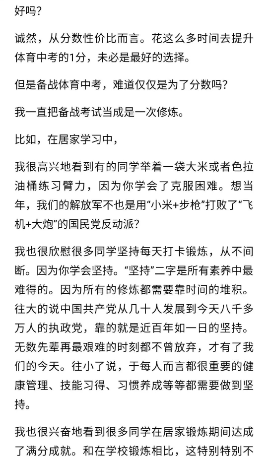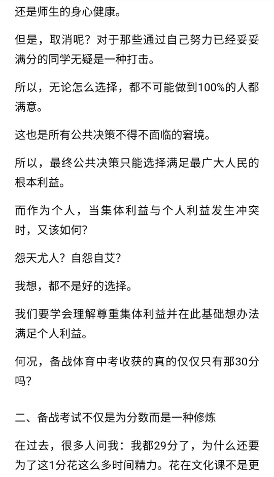 关于今年体育中考取消的不同声音中,消息发出当晚,杭州采实教育集团副校长吕阳俊写下了自己的感想,获得了不少老师的认同。 体育中考取消后写给师生的话