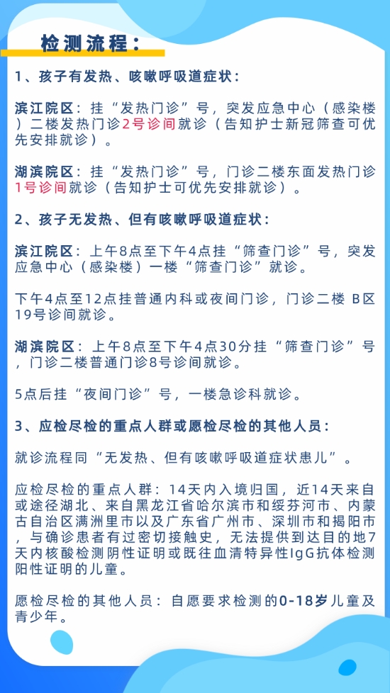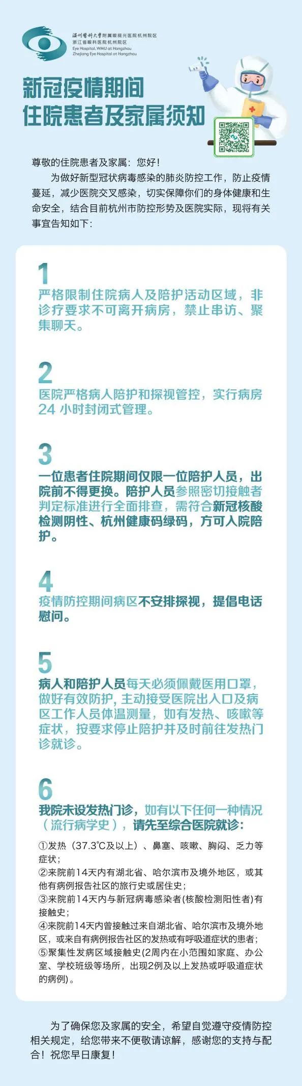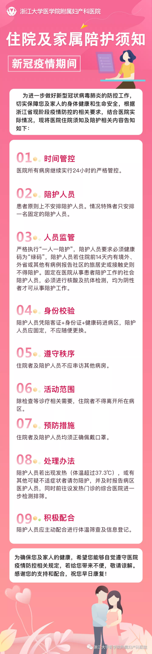 浙大儿院 来院就诊患儿及家属须知: 1.即日起所有病房实行严格的24小时出入管控。 2.特殊时期,病房谢绝探视。 3.内科住院患儿每日限1人陪护;外科住院患儿手术当日限2人陪护,其余时间限1人陪护。陪护人员若为近十四日从外省返杭人员则不得陪护,特殊情况下必须提供新冠病毒抗体(IgG、IgM)检测、新冠核酸检测为阴性报告。 4.陪护人员必须是持有实时健康码绿码者,且人员身份应固定,不得随意更换。陪护人员凭发放的陪客手腕带、实时健康码(绿)及体温检测结果正常三项条件齐全方可进出病区。陪护人员出入病区需出示陪客手腕带,不得携带除生活用品外的其它物品。 5.严禁将非住院儿童带入病房;住院期间患儿不得请假离开医院。 6.患儿及陪护人员不允许串访其他病房的住院患儿。 7.陪护人员若出现发热(体温超过37.3℃),或有其他可疑不适症状者请勿陪护,并同时前往成人医院进一步检测排筛。 8.患儿及陪护人员请戴好口罩,勤洗手,做好个人防护措施,遵守医院的有关规定,并主动配合进行体温筛查及信息登记;特殊情况更换陪护人员请主动告知并登记接受排筛。 9.本院所有监护室、新生儿无陪病房采用电话或视频与患儿家属交待病情,病情需要、特殊情况下允许1名家属(健康码绿码+体温正常)至医院当面交代病情。 同时,为了方便家长和孩子就近检测,自4月24日起,浙江大学医学院附属儿童医院(浙大儿院)同时开放滨江、湖滨两大院区均开通了24小时新冠核酸和抗体检测绿色通道,面向0-18岁儿童及青少年提供24小时的“新型冠状病毒核酸检测”和“新型冠状病毒IgM和IgG抗体检测”服务,为儿童健康及复学保驾护航。