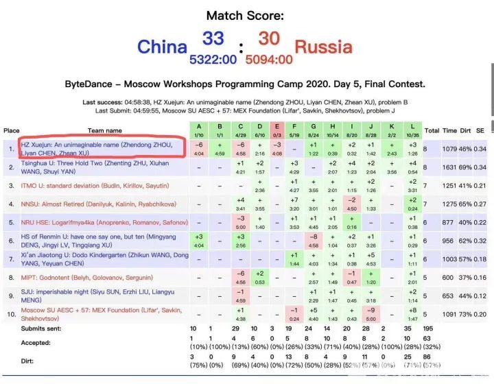 这个冬令营,速来都是强者云集的竞争。 今年聚集了中国、俄罗斯、韩国、日本、美国、加拿大、波兰、白俄罗斯、拉脱维亚、塞尔维亚等10个国家的近200名选手参与训练,可以说代表了当前全球大学生程序设计竞赛的最高水平。同时,训练营还邀请了国内顶尖的高中生队伍,包括学军中学、人大附中、广州二中等。 训练营本来安排在寒假,但是因为疫情推迟到了五一假期,并转到线上。 冬令营每天的安排是从下午3点开始到8点连续5个小时的比赛,第5天根据前面4天的成绩选出中国和俄罗斯的各前5个队伍进行对抗赛。 最后中国进入对抗赛的5个队伍分别来自:清华大学,人大附中,学军中学,西安交大,上海交大。本来前五的队伍还有广州二中,但是因为中学队伍不能超过两个,所以没有能够进入对抗赛。 这次比赛的队伍中有不少俄罗斯强队,比如训练营前四天排名第一的队伍NNSU的Almost Retired队,他们和清华的“三个顶俩”是今年ICPC国际大学生程序设计竞赛全球总决赛的夺冠热门。此外,参加训练营的还有很多有名的选手如Ildar Gainullin(300iq),高谷悠太(yutaka1999),Kelvin Sun(ksun48)等。 最后,经过5小时激烈的比赛,由钻石教练徐先友精心培养的周镇东、陈立言、徐哲安所组成的学军中学信友队代表队发挥出色,在最后一分半钟通过了本次比赛的难题B题,成为全场比赛唯一解出该题的队伍,并且反超比分压倒所有队伍,夺得今年中俄对抗赛的冠军。由王修涵、朱震霆、闫书奕的清华大学队获得第二名,老牌劲旅ITMO队和总决赛夺冠热门NNSU队分列第三名和第四名。 总比分上,中国队以解题数33比30获得了这次比赛胜利。 |