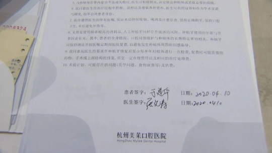 对此,郑先生却表示,在做种植牙前,他们曾经做过一系列检查,仅CT就做了3次。如果当时就告诉他们可能种不了牙,他们一定不会忍痛把好牙拔掉。 随后,医院出示了一份“种植治疗知情同意书”,上面第四条写道: “我同意种植体种类及种植方式,亦同意医生在术中由于新发现的问题而改变原来的种植计划。”