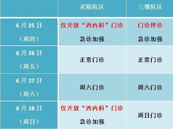 6月25日(周四)放假1天,普通门诊、专家门诊、精英门诊及名医馆按周六开放。