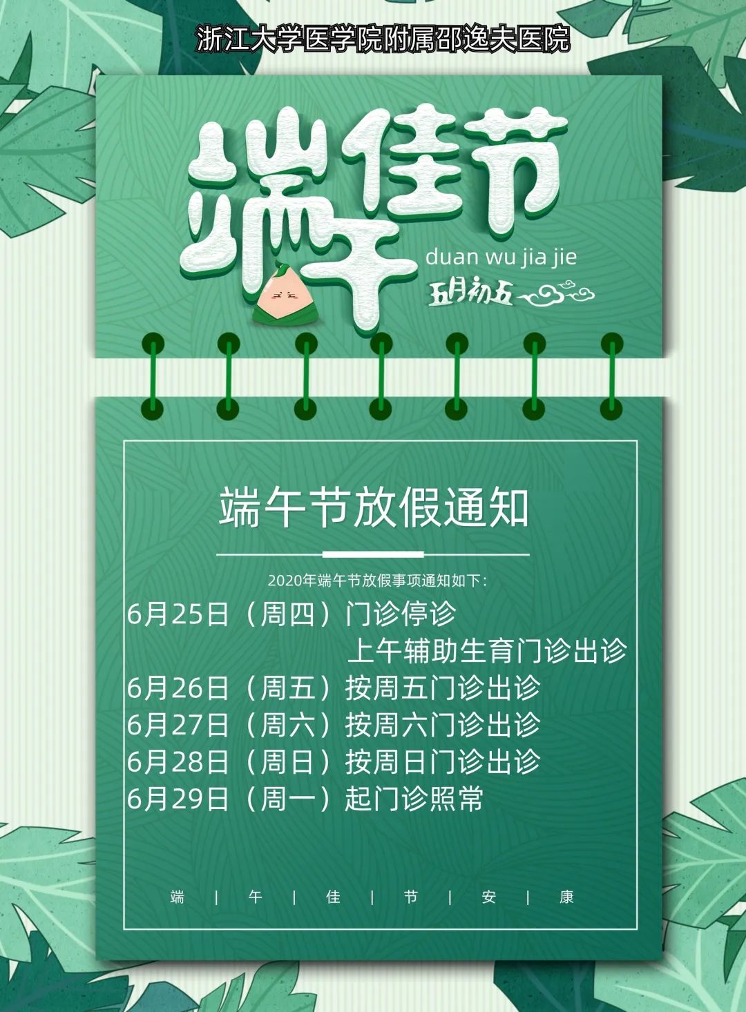6月25日(周四)端午节正常上班。6月27日(周六)、28日(周日)正常双休日门(急)诊。