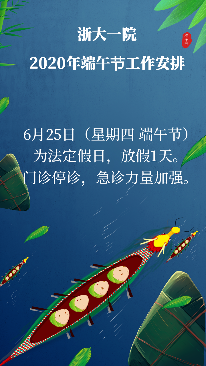 浙江大学医学院附属第一医院浙江大学医学院附属第二医院端午节假日(周四、周五)两院区均正常上班。浙江大学医学院附属邵逸夫医院浙江大学医学院附属第四医院浙江大学医学院附属妇产科医院浙江大学医学院附属儿童医院浙江大学医学院附属口腔医院6月25日—6月27日(端午)普通门诊照常开诊专家、专科与夜门诊停诊6月28日(周日)正常开诊,按周五排班出诊6月29日(周一)起正常开诊浙江省中医院6月25日(周四)、6月26日(周五)全院上班,门诊正常开展。两院区名中医馆及专家门诊以当日排班为准,具体请咨询导医台。