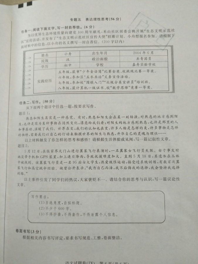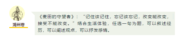 (图片据“浙里金华”微信公众号) 衢州: 根据考生口述,今年作文有大小作文2题。 小作文:(新闻事件)疫情以来,各界捐款抗疫。在杭州萧山务工的河南男子向瓜沥镇政府捐赠13万元,瓜沥镇了解情况后,退回12万元。该不该退回引发热议。你怎么看,写一段话论述观点。不少于150字。 大作文:结合自己的生活体验,写一个关于“变化”的故事。为了让你的故事更吸引人,请学习课本和上面阅读题写故事的方法,可以学习运用悬念、伏笔;也可以学习运用对话推动故事发展;还可以学习叙述者讲述的方式。题目自拟,不少于600字。(据“衢州发布”) 舟山: 从下面两个题目中任选一 题,按要求写作。 题目1: 熟悉和陌生其实是一种感觉。 有时,熟悉和陌生会在某一刻转换:对熟悉的地方感到陌生,也许是因为某种事物在悄然变化,漂亮给我们看;对陌生的地方感到熟悉,也许是那里的人和事感动、温暖了我们。世界在变,我们的认知也在变,许多人物是怎样的美,许多事物是怎样的独特,需要我们以自己的行动来触摸世界的陌生与熟悉,升华自己的灵魂与理性...... 以上材料触发了你怎样的思考和感悟?请根据生活体验或见闻,写一篇记叙性文章 。 题目2: 5月12 日,在张家界天门山进行翼装飞行表演时,一名翼装女飞行员失联。由于事发时她没带手机和GPS装置,加上连日降雨,导致救援难度加大。直到5月18日,其遗体在丛林中被找到。该翼装飞行员是一名95后女大学生,热爱极限运动,接受过系统训练,有数百次翼装飞行和高空跳伞经验。她曾公开表示:“我为自己而活,我不后悔我的选择,我会坚持我选择的路。” 以上事件引发 了同学们的热议,大家褒贬不一。请结合你的思考与认识,写一篇议论性文章。 写作要求: (1)自选角度,自拟标题。 (2)不少于600字。 (3)不得抄袭,不得套作,不得泄露个人信息。 (据舟山晚报微信公众号) 台州: 根据考生口述: 材料:父母说自己的孩子在某一方面不如别人家小孩,在另一方面也不如别人家小孩,可孩子说自己有一样比别人好。请问引发了你什么思考? 丽水: 根据考生口述: 阅读一段有关“童话”的材料,自拟题目写作。材料大概内容是生活是否需要童话(记者注:也有考生说是生活不需要通话)。考生可以写议论文,也可以写想象作文等。 |