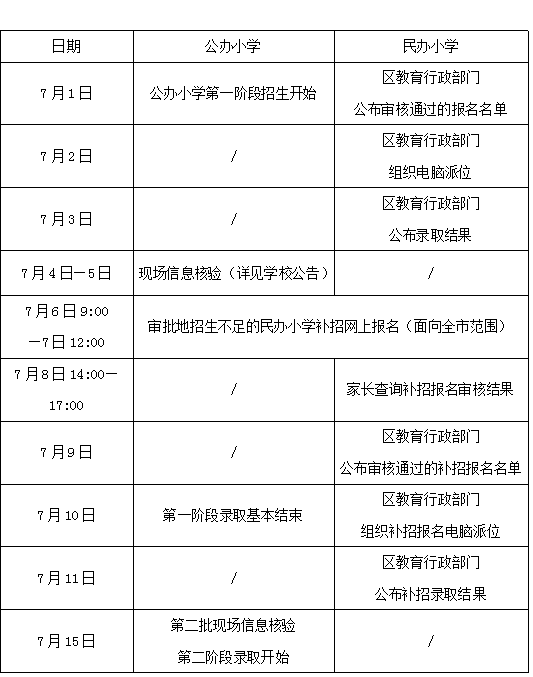 杭州发布 根据《杭州市教育局关于做好2020年义务教育阶段学校招生入学工作的通知》(杭教基〔2020〕5号)要求和入学流程,2020年杭州市小学一年级入学现场信息核验工作将于7月4日、5日二天进行(报名民办小学审核通过但电脑派位未录取的儿童,7月15日进行公办小学招生现场信息核验),请申请公办小学入学的适龄儿童家长,根据区、县(市)教育局(教卫局、社发局)的相关公告参加现场信息核验。 2020年杭州市小学一年级入学后续时间安排