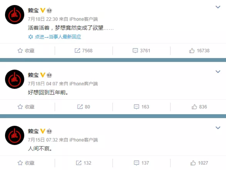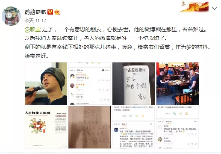 微博上大V也纷纷转发赖宝去世的消息。 编剧鹦鹉史航更新:“赖宝走了,一个有意思的朋友,心梗去世。他的微博戳在那里,看着难过。以后我们大家陆续离开,各人的微博就是唯一一个纪念馆了。剩下的就是有幸线下相处的那点儿碎事,暖意,给亲友们留着,作为梦的材料。赖宝走好。”