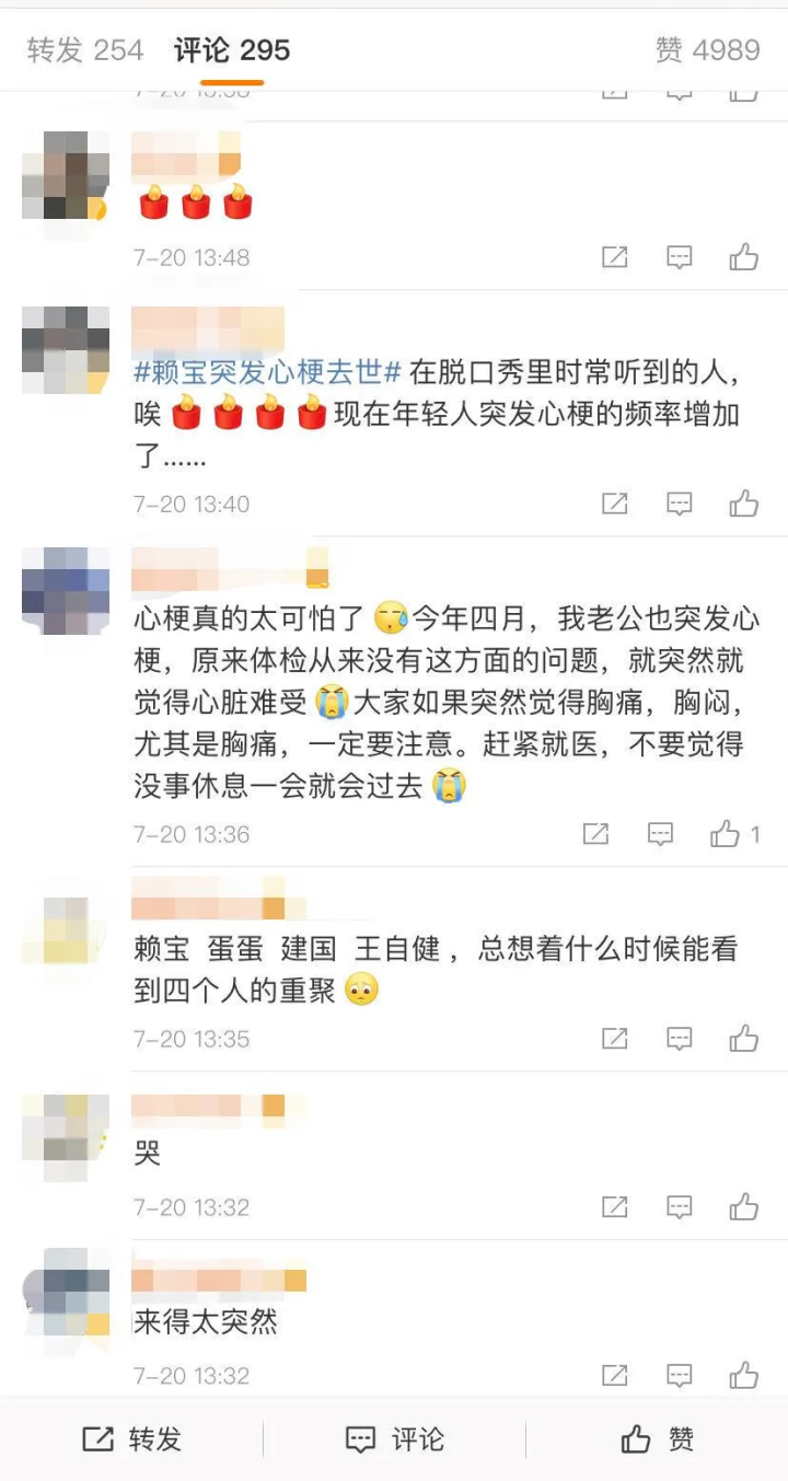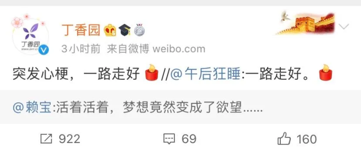“丁香园”转发了赖宝最后的微博,配文“突发心梗,一路走好。”