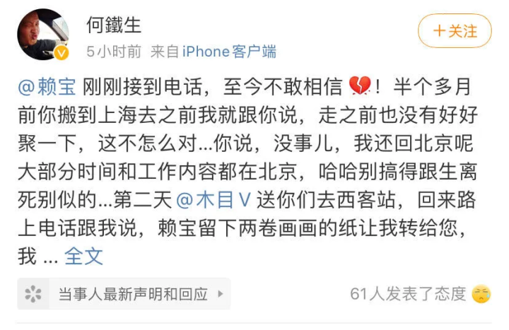 书画家何铁生在微博发文悼念,“半个多月前你搬到上海去之前我就跟你说,走之前也没有好好聚一下,这不怎么对……你说,没事儿,我还回北京呢,大部分时间和工作内容都在北京,哈哈别搞得跟生离死别似的……”“可,没想到,这一切竟是这么突然!绝对不愿意相信这是真的。”
