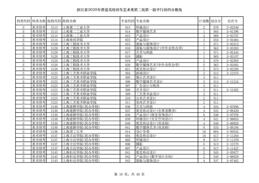 浙江省2020年艺术类第二批第一段平行投档分数线