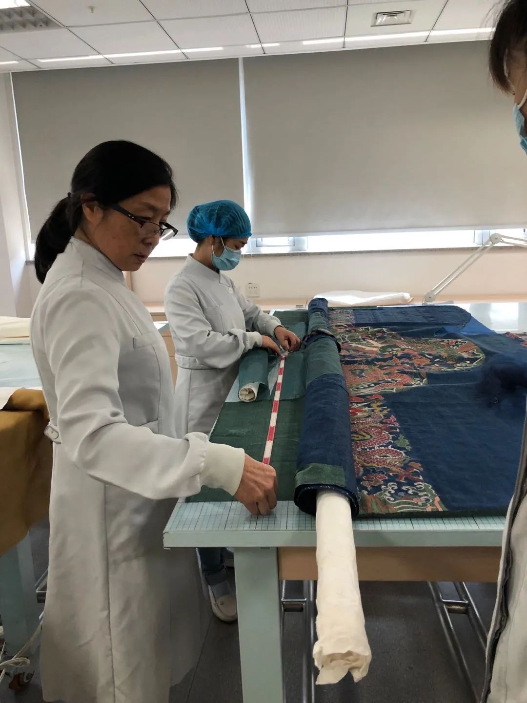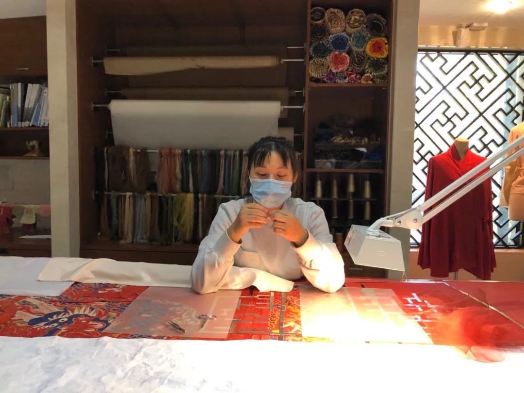 楼淑琦是从丝织厂最基层开始工作,对纺织品如数家珍,因此也能想出各种办法来解决修复时技术上的难题。 “修旧如旧”,是文物修复的一个重要原则。衣服分里外两层,修复师们需要将面料和衬里分别进行修复;糟朽严重,缝的时候力度不能太大;丝线凌乱,就一根一根理直;“福”字金线脱落严重,就按照原来的针线走向,细心缝补。 不仅是修物,也是修心 “对文物要有敬畏之心。文物修复,不仅是修物,也是修心。”楼淑琦是整个团队里最资深的,带团队也是她的工作之一,“我特别喜欢看到整个团队劲儿往一处使,一起来解决一件事的样子。”