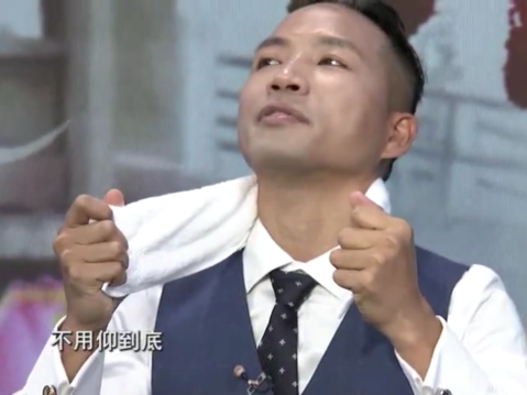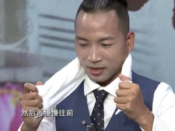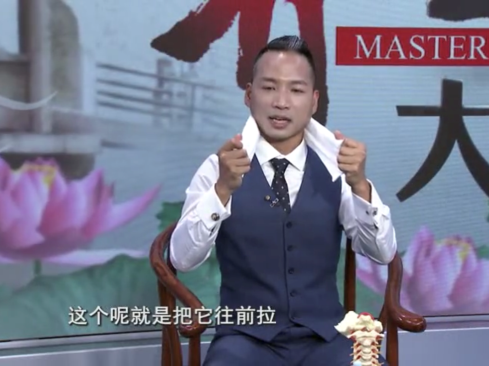 1 拿一块毛巾放在脖子 后面; 2 两只手往前拉毛巾;