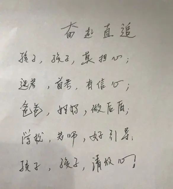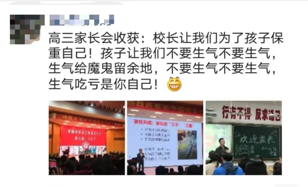蔡校长告诉家长们:“要为了孩子保重自己,要为孩子创造好的环境,还要为孩子寻找到合适的路径。” 让家长为了孩子保重自己,是说高三压力大,家长们容易精神紧张,如果因此身体不舒服,孩子受的影响更大。家长最好保重好自己,为孩子们做好后勤,全家都好。 好的环境,是指安静的学习环境、和谐的家庭环境。孩子学习时,父母不在旁边做一些影响孩子的行为,比如看电视、打麻将等。 为孩子规划教育路径,是说现在考985、211高校不是唯一出路,孩子们还可以走特长生、高水平运动员途径,考艺术、传媒、体育类学校。路径很多,不需要让孩子千军万马挤独木桥,视野可以更开阔一些,毕竟每个孩子都有自己不同的兴趣点,自然可以有不同的方向。 听到这几句,家长们笑着鼓起掌来。等到讲座结束,走进教室,大家笑得更开心了。高三(9)班的家长走进教室,依次坐在孩子的座位上。抬头一看黑板,忍不住笑出声来。 因为继校长劝慰家长之后,孩子们也开始劝爸妈了。 三(9)班的学生创作了一首打油诗,标题《家长心经》,内容有“洗脑式”的直白,让人看了,无奈又好笑。