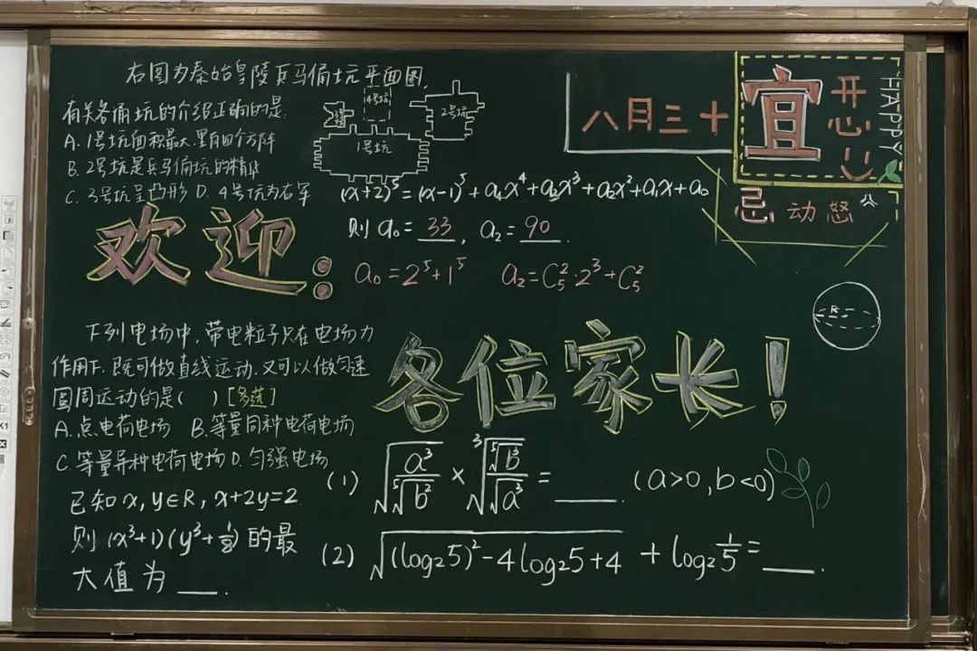 他们班的黑板右上角,还画了黄历,藏着孩子们的小心机,因为写着“今日宜开心,忌动怒。” 学生处副主任吕昳老师说:“疫情防控以来,高三第一次组织全年级家长会。家长们先在礼堂听校长讲座,然后进教室,和班主任沟通。我们布置给学生的任务是,在黑板上写个‘欢迎家长’,没想到孩子们都自由发挥了。”