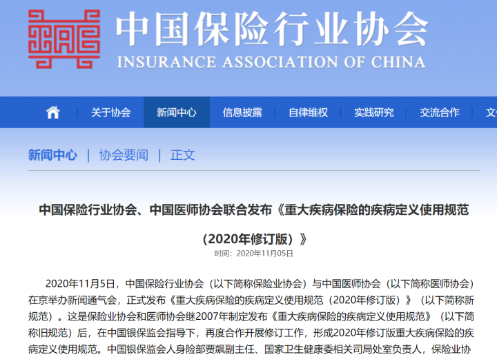 都市快报讯 备受关注的重疾险规范修订终于出炉。 11月5日,中国保险行业协会在官网正式发布由中国保险行业协会、中国医师协会牵头制定的《中国重大疾病保险的疾病定义使用规范(2020年修订版)》(以下简称“重疾新定义”)以及中国精算师协会制定的《中国人身保险业重大疾病经验发生率表(2020)》(以下简称“重疾表”)。