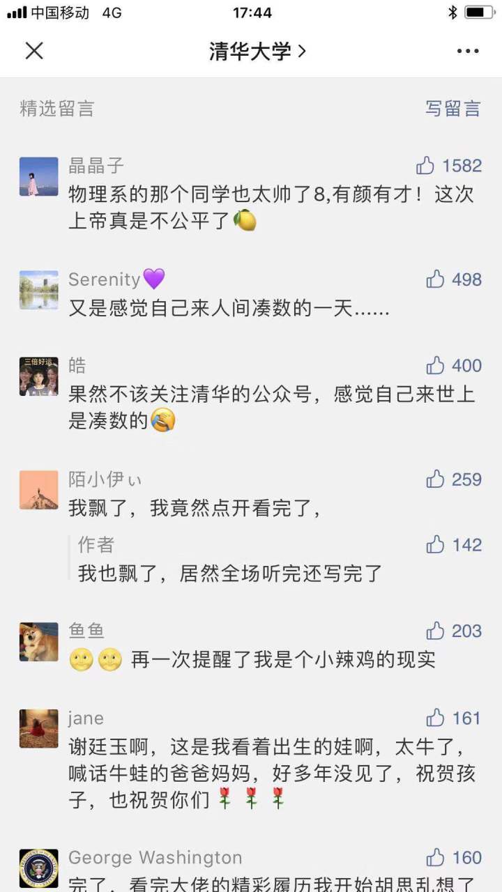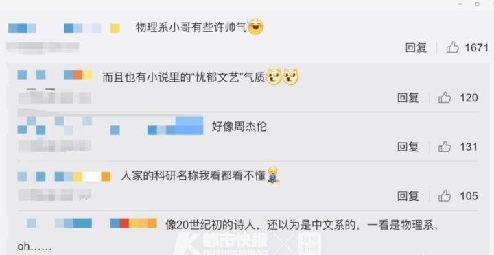 一条”物理系小哥有些许帅气”的评论,被赞了1600多次。这条评论底下,网友们也在回复:“好像周杰伦”“像20世纪初的诗人,还以为是中文系的”“有小说里的忧郁气质”…… 清华大学官微下面的评论,是这样的画风: