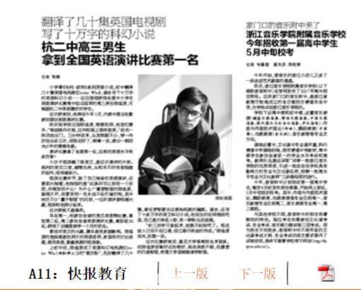 这个英语演讲的超强能力,进入大学后,也在继续发挥。读大二时,他第二次参加21世纪全国英语演讲比赛,又拿到冠军。 他小学看《哈利·波特》系列原版小说,初中翻译几十集英国电视剧《Doctor Who》,课余写下十万字的英语科幻小说…… 当时记者采访他,小伙子现场飙了段英文,是这次演讲的片段。流利的英式口音,感情充沛,头和手不时有些轻微的动作,很有感染力。 对英文的兴趣,最早是受家庭影响。陈逸贤的爸妈都是杭师大的英语老师,家里有时讨论话题,都用英语,就像美剧的现场版。 上初中后,陈逸贤成了英国科幻电视剧《Doctor Who(神秘博士)》的“骨灰粉”,先后翻译了几十集,曾经梦想要当这部电视剧的编剧。课余,还写了十多万字的英文科幻小说,他说当时在网络贴吧里,自己是大神级人物,有一群粉丝在追随。 “初三后学习紧起来,我就不玩贴吧了。现在我人已经不在江湖,但江湖仍有我的传说。”陈逸贤说完,狡黠一笑。 除此以外,陈逸贤还积极发挥自身学科优势和语言能力,促进基础科学的研究和交流。仅在大学的3年期间,他有着7次国际会议的参会/展示经历。 值得一提的是,陈逸贤课余积极参与文体活动,3年来跟随集体参加了10余场校级演出。而其本人,还是校艺术团合唱队的一队队员。 下午,记者联系上陈逸贤的爸爸陈先生。关于这场“神仙打架”的竞争,父子俩在三年前就讨论过。