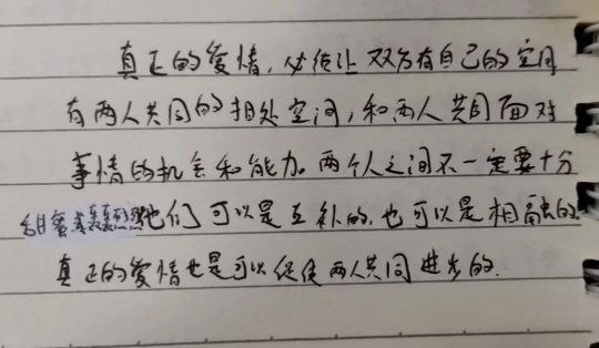 真正的爱情,必须让双方有自己的空间,有两人共同的相处空间和两人共同面对事情的机会和能力。两个人之间不一定要十分甜蜜或轰轰烈烈,他们可以是互补的,也可以是相融的。真正的爱情也是可以促使两人共同进步的。