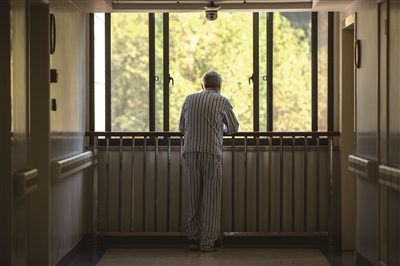 一位中度阿尔茨海默病患者在走廊尽头看窗外的风景。 首席记者 陈中秋 摄