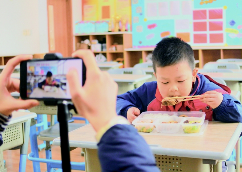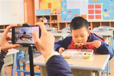 到了周三中午,当周制作的吃播视频就会在每个班级中播放。“在学生们吃饭之前,会先放吃播视频。其实到中午的时候,孩子们都有点饿了,再看视频中的同学吃得那么香,感觉就更饥饿了。所以每周三的中午,孩子们都会吃得快一些,光盘的人也会更多一些。”傅老师介绍。这也许就跟成年人半夜看吃播视频时一样吧,会情不自禁产生一种“好想吃好想吃好想吃”的感觉。